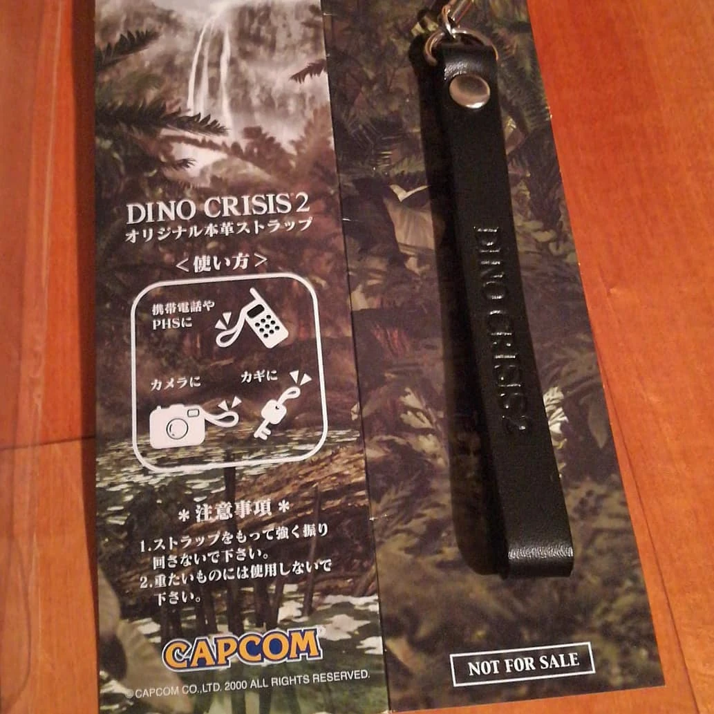 Dino Crisis 2 Original Leather Strap (DINO CRISIS 2 オリジナル本革ストラップ,DINO CRISIS 2 Orijinaru honkawa Sutorappu?) is a leather strap sold in 2000 to advertise Dino Crisis 2.[1] It was marketed for use on phones, cameras and keys.