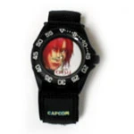 "Dino Crisis fans can now keep time with the Dino Crisis Watch! The face features Regina and the Dino Crisis logo. Sturdy velcro stlye watch band is included with Capcom logo on the wrist. (Batteries not included.)" |