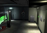 Two elevators are located here leading down to the laboratory area, one to the right is broken and cannot be used. The map of the first and second floors for the facility are shown on the display panel. There is a dead body, wearing white clothing, possibly one of the researchers that previously worked inside the facility. There is also a box which was used for personnel to check who uses the elevators.