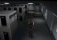 A Velociraptor is found laying in between the data storage with red and green category, it will attack should Regina approach it. The player can find a case on the ground, inside it will contain the handgun upgrade part. Also, a Med Pak M is located near the research area hall entry.