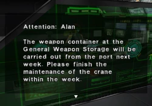 来週、 一般兵器庫の武器コンテナを港より搬出する。 兵器庫のクレーンの整備は今週中に済ませておいてほしい。