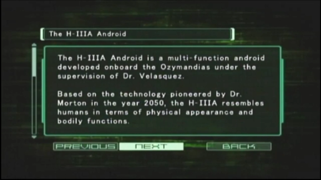 The H-IIIA Android is a multi-function android developed onboard the Ozymandias under the supervision of Dr. Velasquez.