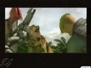 In the Edward City level, players would take control of a mini tank while escaping from the T. rex. Although the T. rex can be brought down using the tank's cannon, it'll get back up again and chase after the player.